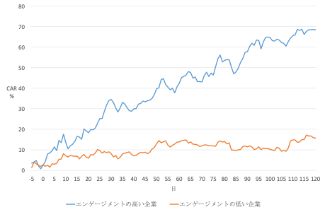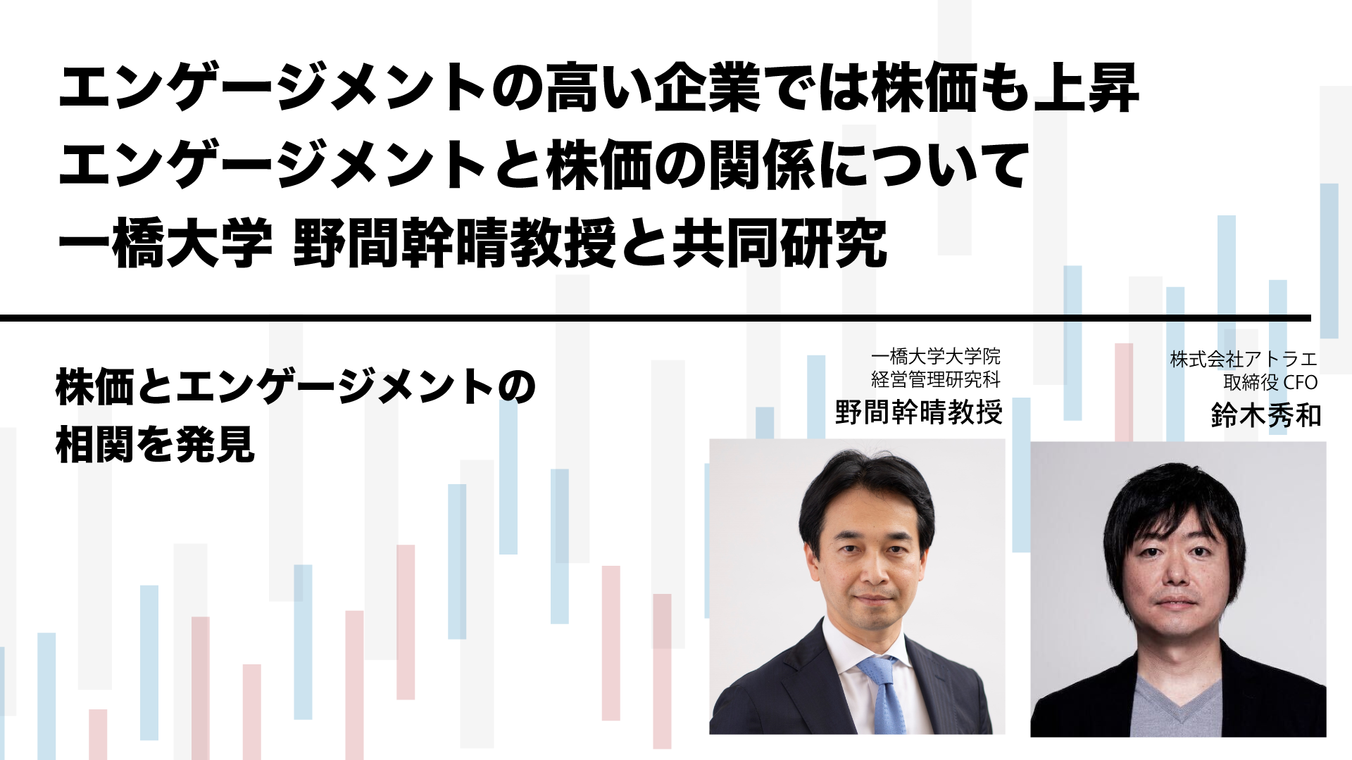 一橋大学野間幹晴教授と連携し、「Wevox」を用いて測定したエンゲージメントと株価について研究。2020年4月7日に緊急事態宣言が発出された日をイベント日とするイベント・スタディを実施したところ、エンゲージメントの高い企業では株価が約65%上昇したものの、エンゲージメントが低い企業では株価上昇の効果は小さかった。