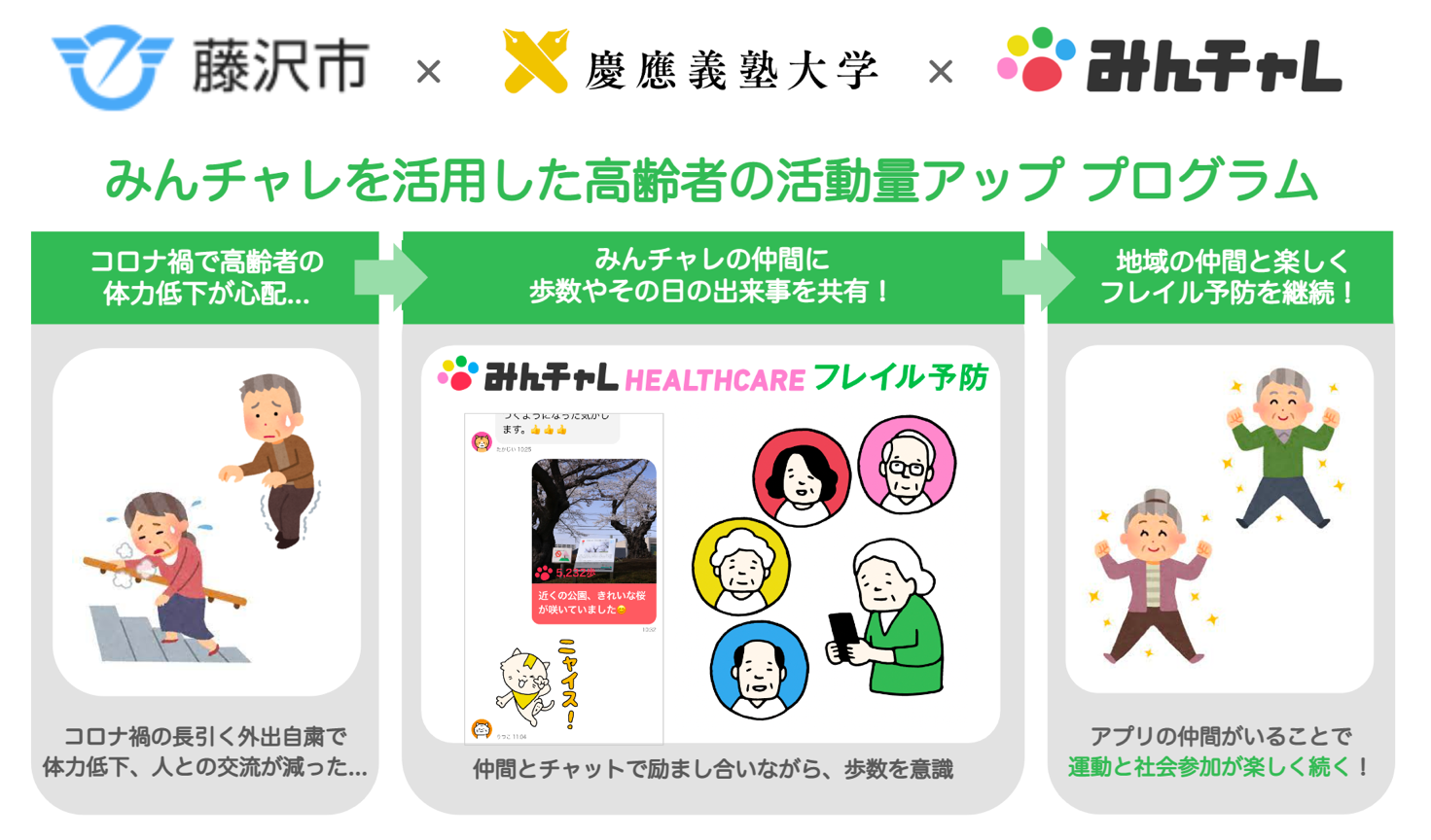 産学官が連携してチーム制アプリを活用した高齢者の身体活動量の変化を検証する本取組は、フレイル予防業界初となります。コロナ禍で高齢者の活動量の減少や人とのつながり不足が懸念されていたことから、藤沢市・慶應義塾大学と連携の上、実施にいたりました。