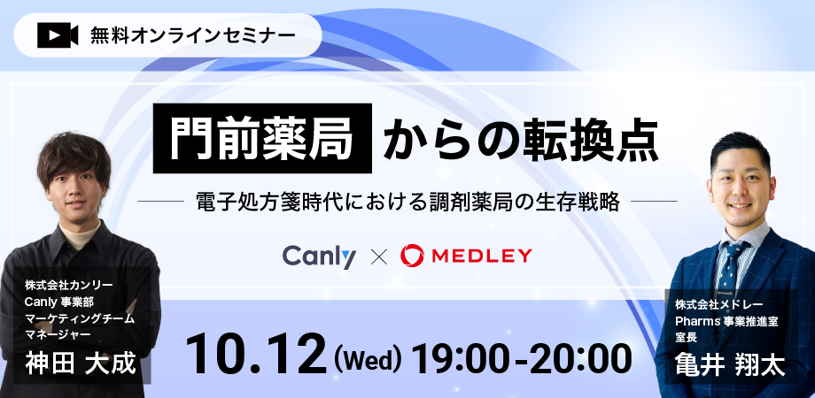 Googleビジネスプロフィール・HP・各SNSの一括管理サービス「Canly(カンリー)」を提供する株式会社カンリーと、かかりつけ薬局支援システム「Pharms(ファームス)」をはじめ医療プラットフォーム事業を展開する株式会社メドレー。