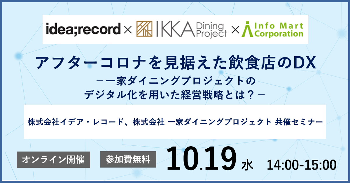 コロナ禍に積極的な業態転換や新規出店を進めた一家ダイニングプロジェクト様より、出店と効果的な集客施策、バックグラウンド業務のデジタル化を進めた背景と実情、さらにそれらの業務革新を支えた当社とインフォマートの取り組みをお伝えします。