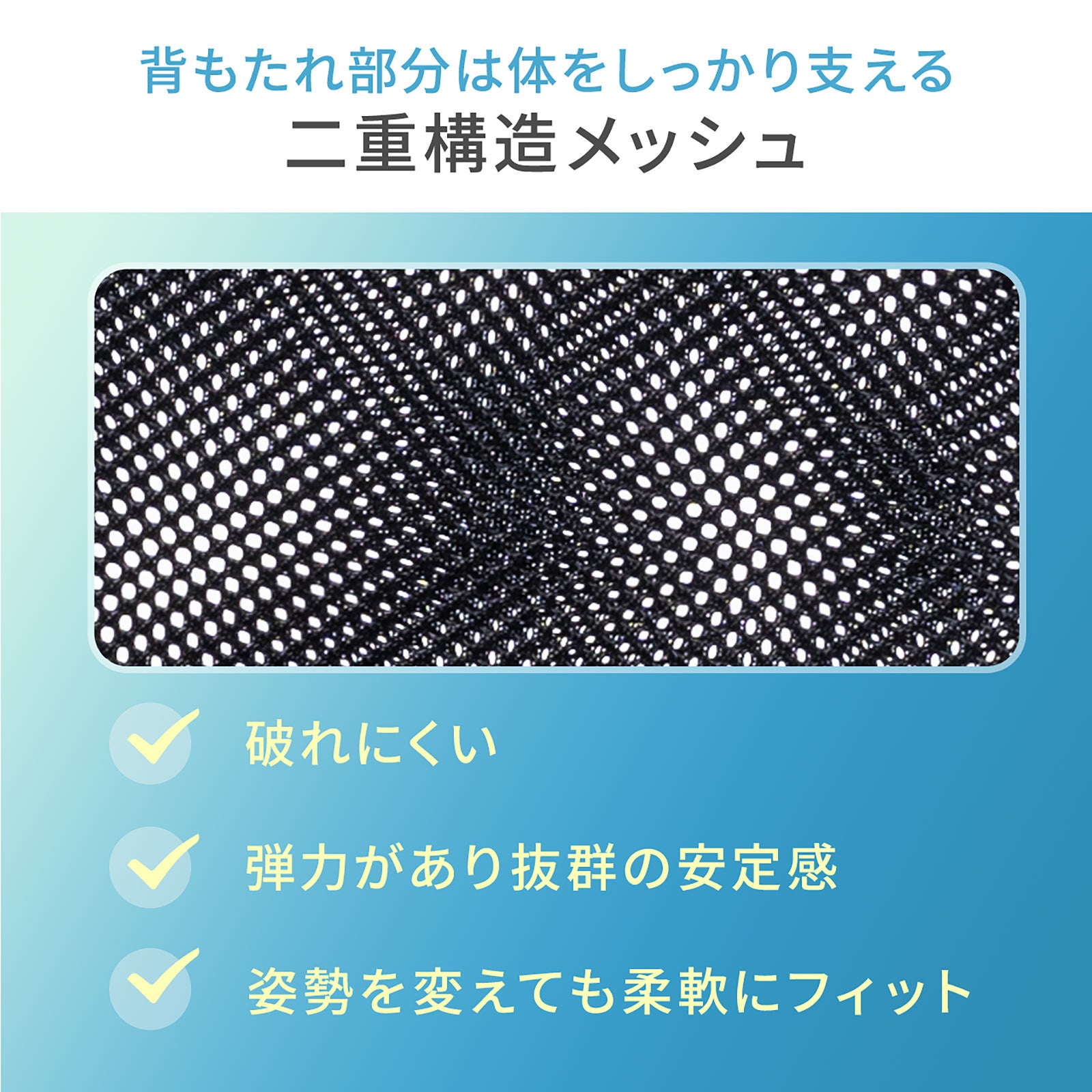 背もたれは二重構造のメッシュ素材を採用しているので、椅子独特の蒸れや圧迫感を極限まで抑えています。通気性の良さはもちろんのこと、姿勢を変えても柔軟に対応する二重構造ならではのフィット感を実現しています。