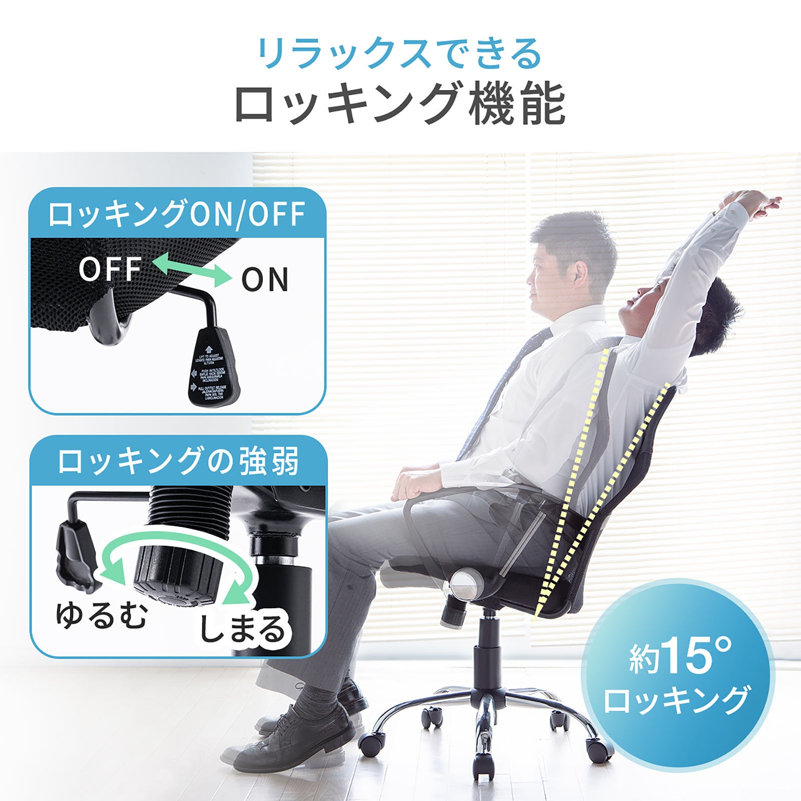 ロッキングは背座連動ロッキングを採用しており、作業の合間にリラックスすることができます。