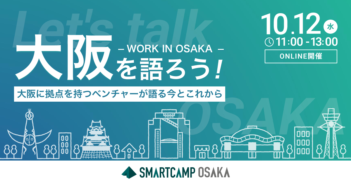 「大阪を語ろう!- WORK IN OSAKA -」(以下「本イベント」)は、2022年8月に開設したスマートキャンプの大阪拠点が企画、運営し、大阪のリアルな今を全国に届ける目的で開催するオンラインイベントです。第1回は、ビジネスを展開するうえで大阪エリアをどう捉えていくかを軸に、大阪に本社や拠点を持つベンチャー企業の経営者や支社長などとともに、具体的事例に触れながらトークを繰り広げます。
