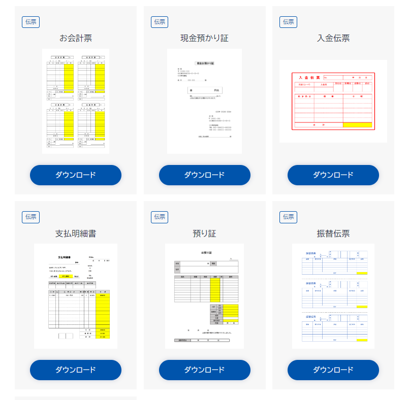 「帳票テンプレート集」では、実務で使用できる入金伝票や貸借対照表、総勘定元帳などのテンプレートを、無料でダウンロードできます。