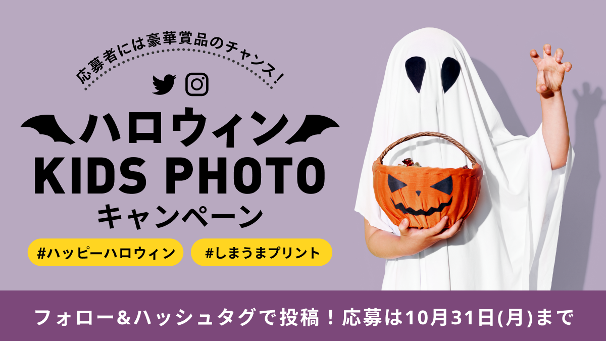 TwitterまたはInstagramでご応募の上、専用の応募フォームでご応募いただいた先着100名様に、お気に入りのお写真1枚としまうまプリントオリジナルのハロウィンカードをプレゼントいたします。