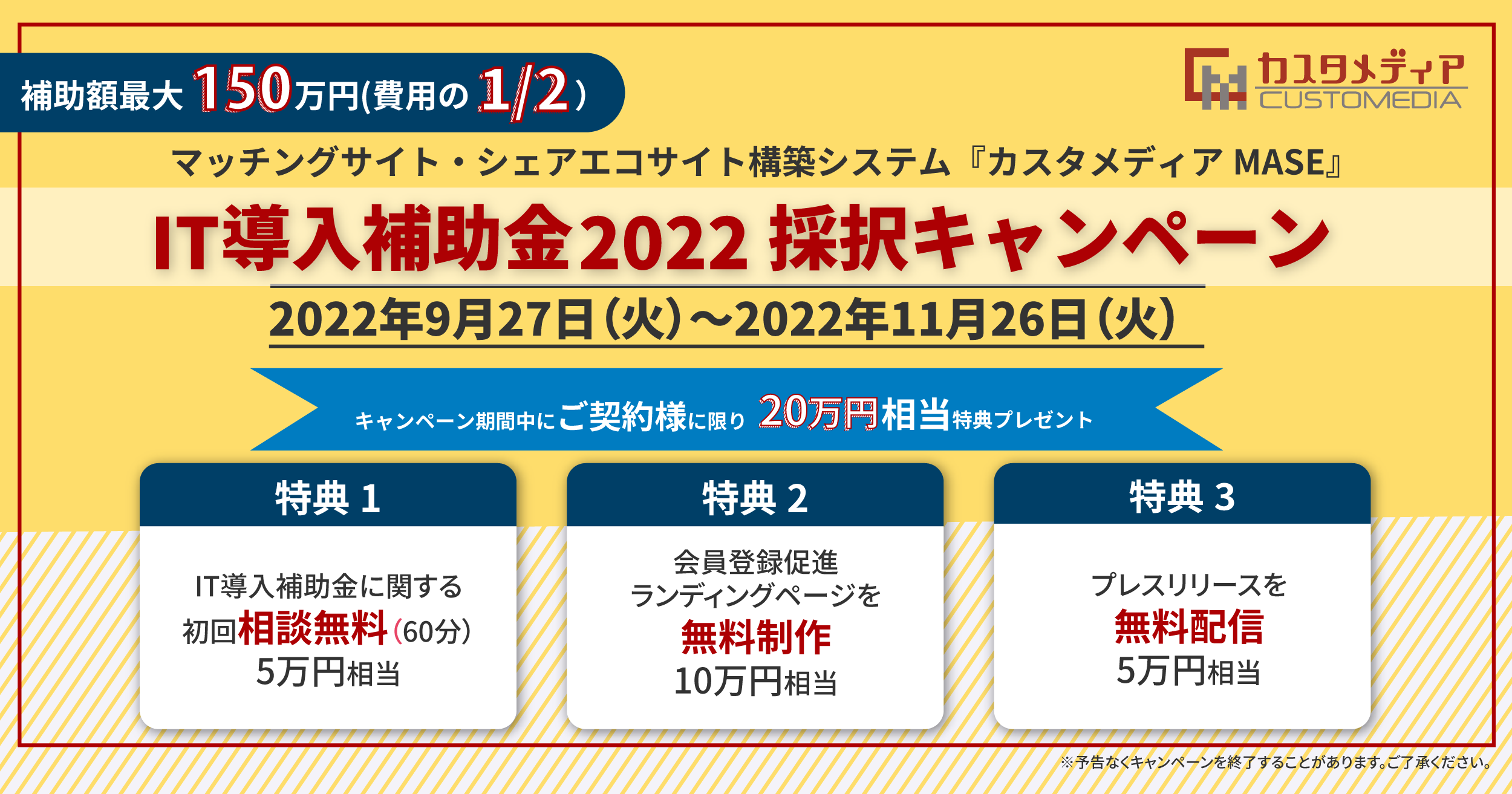 また、採択を記念して2022年11月まで「IT導入補助金 採択記念キャンペーン」を実施いたします。
