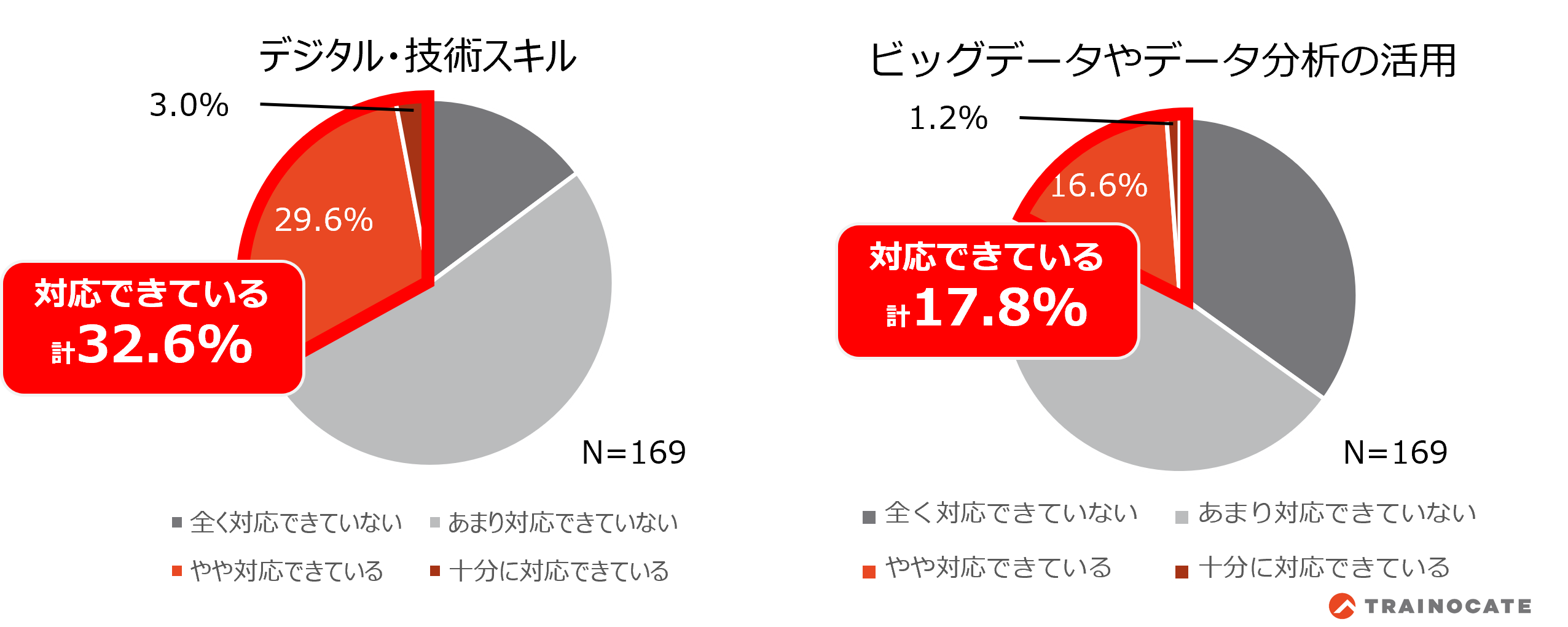 調査指標の中でも特に日本の評価が低かった①「デジタル・技術スキル」②「ビッグデータやデータ分析の活用」に関して、日本は世界と比べてどの程度のレベルかという質問に対し「標準以上」と答えた人がそれぞれ①58.0%/②49.7%に登り、実態と国内の認識にズレが生じています。なお、同じ項目について自身または自社がそれに対応できていると答えた人はそれぞれ①32.6%/②17.8%に留まりました。