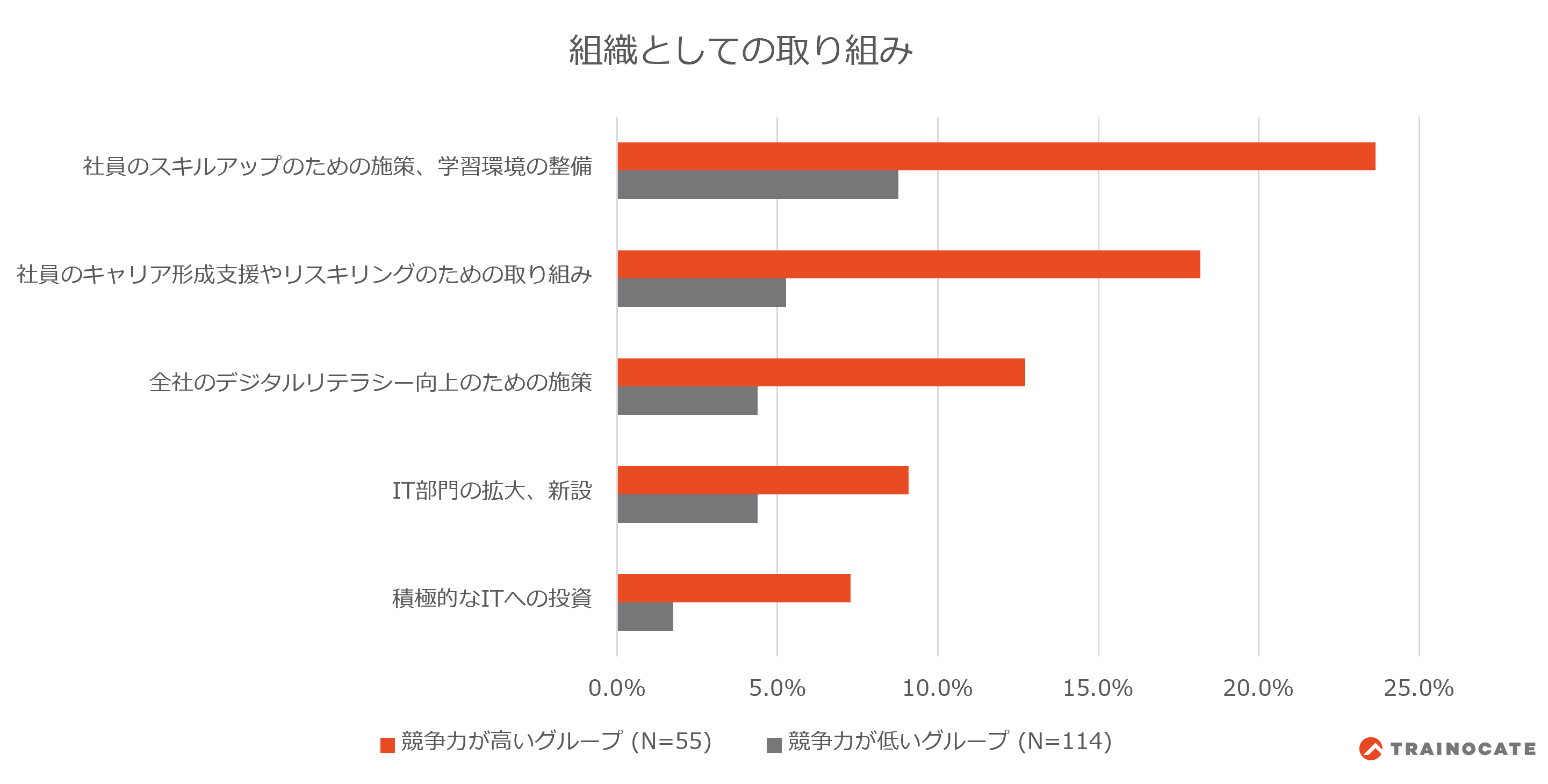 「デジタル・技術スキル」への対応が進んでいる個人・企業を競争力が高いグループと見なし、「デジタル・技術スキル」を向上させるために取り組んでいることを、そうでない個人・企業と比較したところ、個人では「学習など、スキルアップのための取り組み」「積極的な情報収集」をしており、企業としては「社員のスキルアップのための施策、学習環境の整備」や「IT部門の拡大、新設」「積極的なITへの投資」などに取り組んでいることが分かりました。