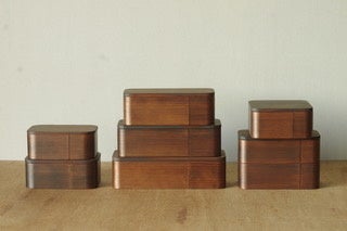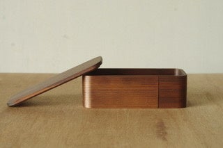 軽くて手触りのよい杉の木に漆塗りをしている「呼吸する弁当箱」です。
