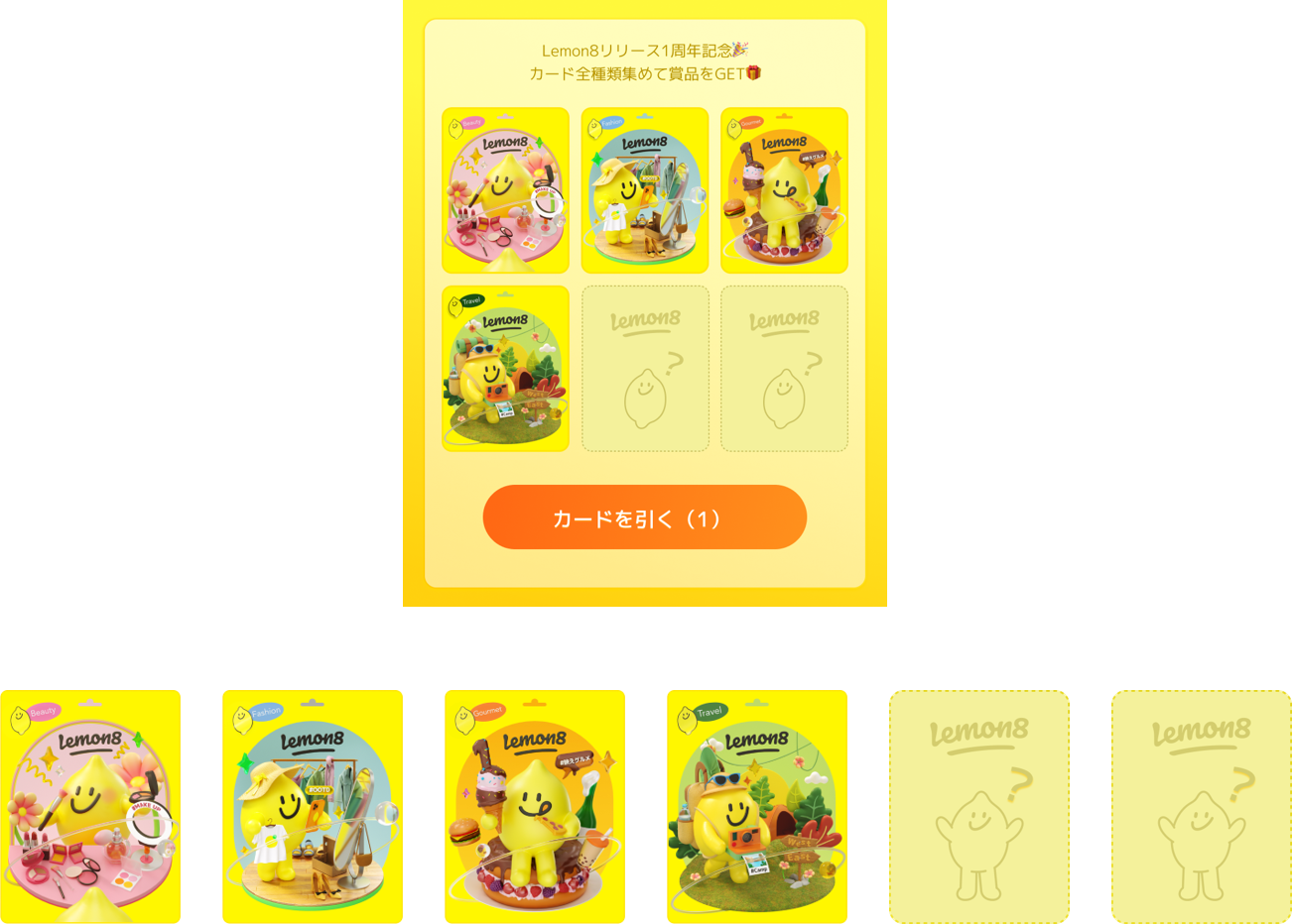参加方法:Lemon8アプリ内にて、ミッションを1つ達成するごとに1回カードが獲得できます。期間中にカードを6種類コンプリートしたユーザー様、全員に美容家電や旅行券などの豪華ギフトを1つプレゼントします!(※賞品内容は選べません)