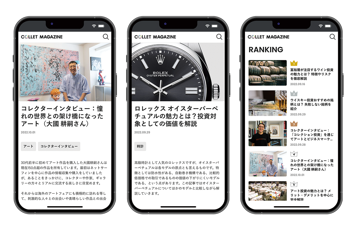 当メディアでは、コレクション資産管理サービス「COLLET」で展開するアート/時計/ワイン/スニーカー/トレーディングカードに加えて、近年注目を集めるウイスキーやアンティークコインなど幅広いカテゴリを網羅。それぞれのカテゴリにおける「コレクション投資のはじめ方とメリット・デメリット」といった入門編コンテンツのほか、「オススメの銘柄」や「注目すべき作家」など実用的なコンテンツも多数用意しています。