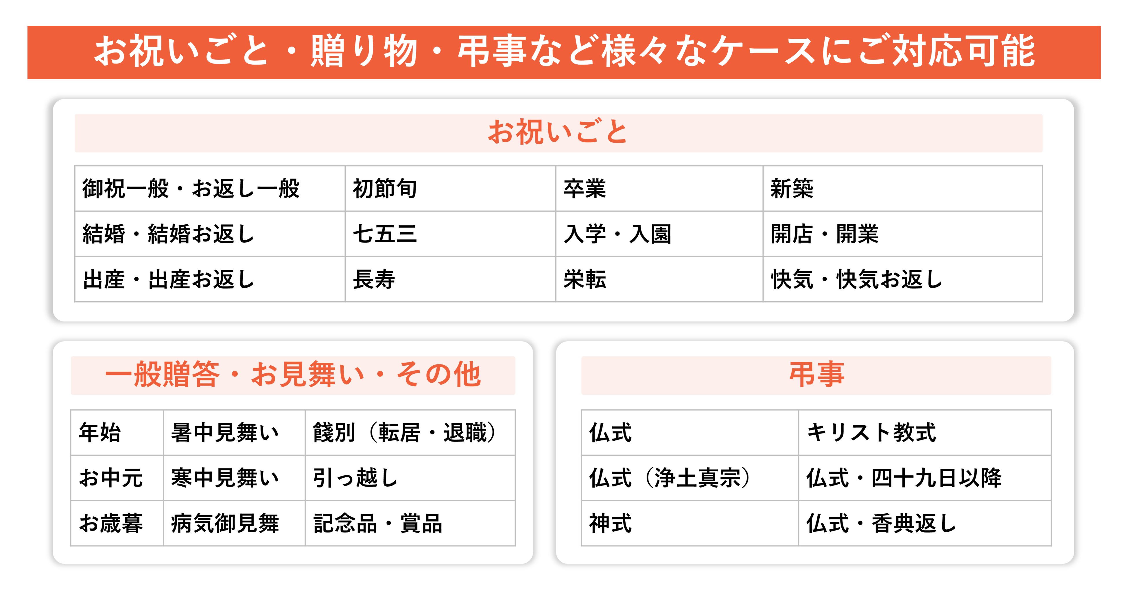 「のし紙」は用途に応じて選択できる方式を採用し、何を使えばいいのかわからないといったお悩みも解消。