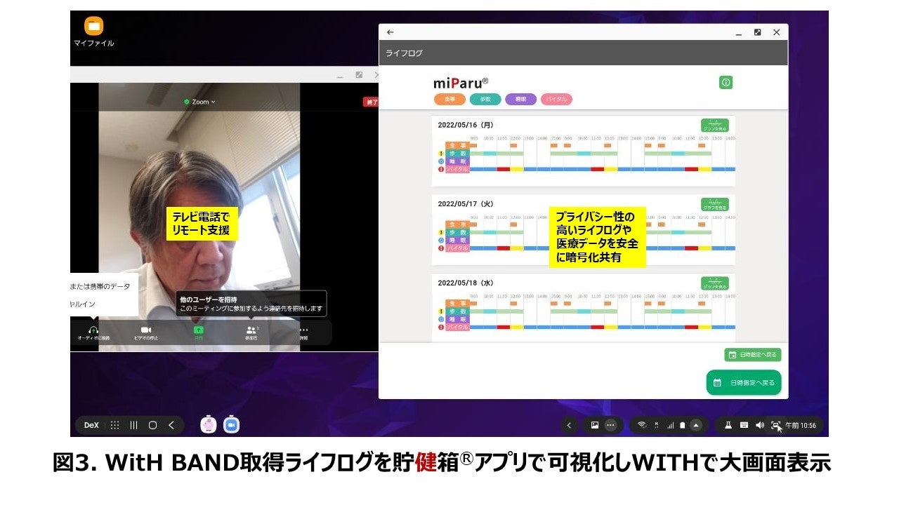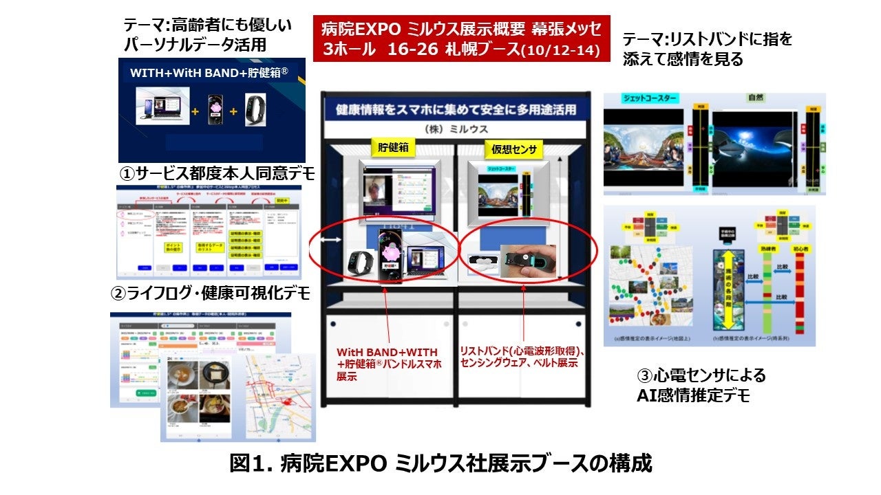 今回のミルウス社展示のテーマは「貯健箱(R):高齢者にも優しいパーソナル・データの活用」と「仮想センサ技術:リストバンドに指を添えて感情を見る」です。 前者は本年11月末に販売開始されるHTL(株)のスマート・ウォッチ「WitH BAND」のバンドル・アプリとして提供されます。後者は来春サービス開始予定の「仮想センサ」の主要機能として提供予定です。