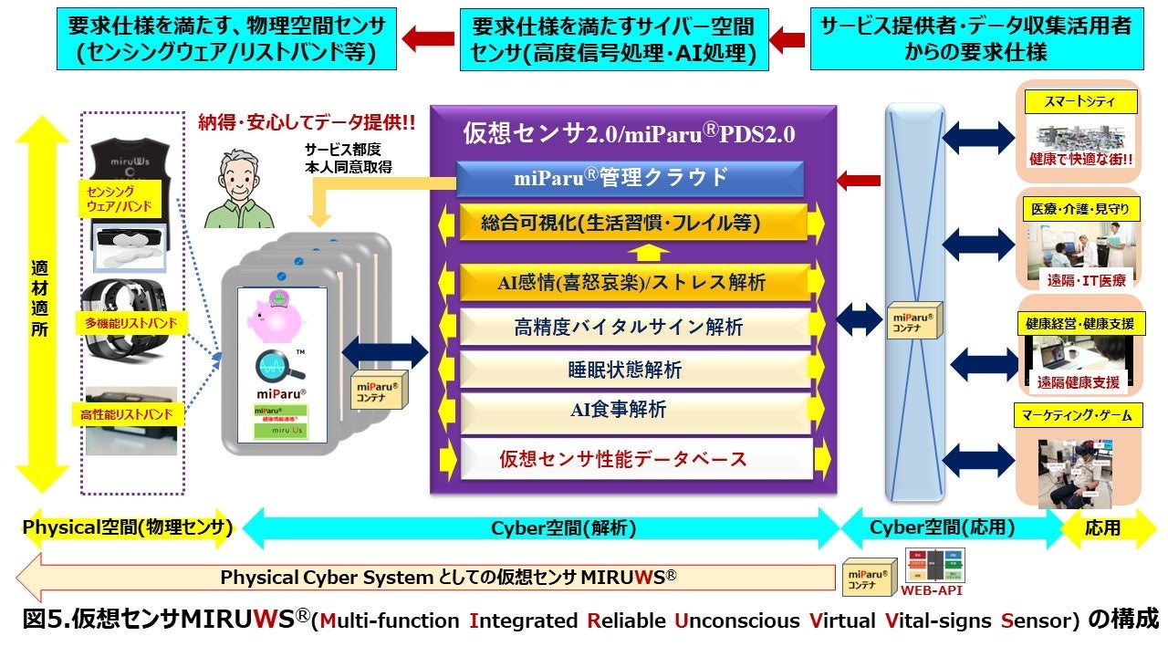 これらの製品や技術は、来春を目指して開発中の仮想センサ2.0/ミパルPDS2.0(図5)に搭載予定です。多機能リストバンドから高精度リストバンド迄の多様な物理センサと、これらを用いた時の仮想センサを有効に活用するためには、それらの性能に応じた活用が鍵となります。 弊社共同研究先である東北医科薬科大(住友教授)との連携により、仮想センサを含む各種センサの性能測定並びにデータベース化を推進し、センサを識別するセンサIDでアクセスすることにより、用途に応じた最適なセンサや解析が選択できる環境を目指します。また、パーソナル・データの流通に於いて、センサIDで多様なセンサの性能と紐づける必要がありますが、この標準化につきましてはセキュアIoTプラットフォーム協議会での標準化活動の一環として業界各社と連携して推進します(※7、※8)。