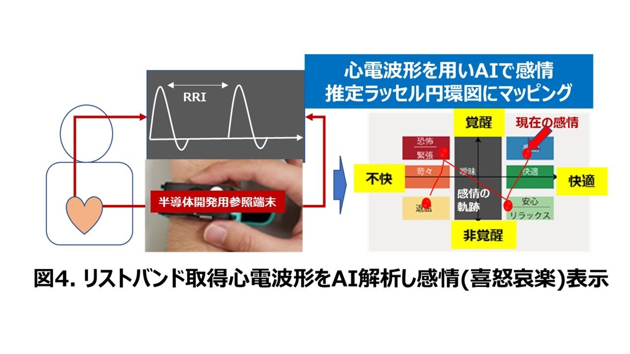 今回展示する試作システムは、下図4に示すように、LSI応用システム開発用に販売されている開発用参照リストバンドを用い、そこで得られる心電波形をPCに入力し、AI感情推定により可視化するもので、最終的には、このPCアプリをスマホやクラウド上に搭載することにより、リストバンドに約1分指を添えることにより喜怒哀楽が1分ごとに更新されます。