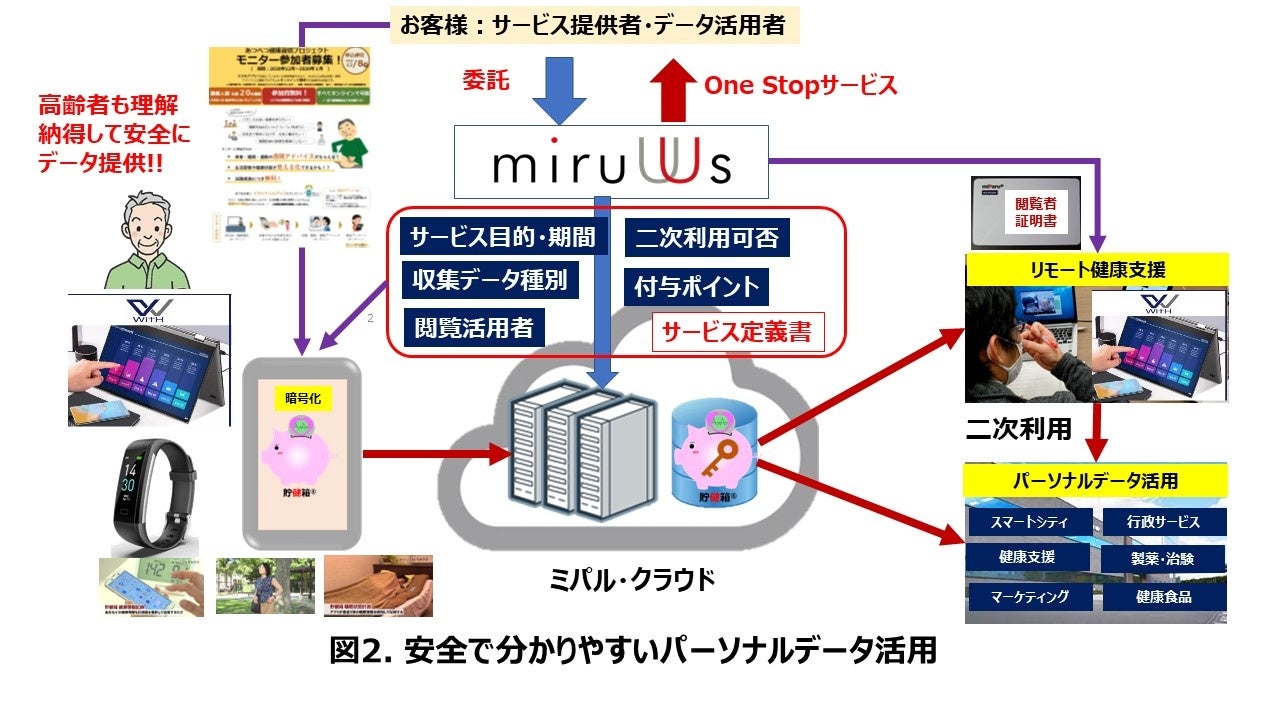 時計感覚で、装着するだけで歩数や睡眠等の多様なデータを取得できるスマートウォッチの普及が始まっています。今回の展示では、高齢者でも自身のパーソナル・データを多様な用途に安全に活用できる「WitH BAND+WITH+貯健箱(R)」システムの紹介とデモを行います。弊社が提供する「貯健箱(R)」アプリは、図2に示すように、サービス毎の本人同意を特徴としており、不安になりがちなパーソナルデータ提供を、理解・納得して実施していただくことにより、プライバシーの保護とデータ活用の両立を図ります。また複数の事業者、サービスに対応できるため、スマホ画面が多様なサービスアプリであふれることを防ぎます。