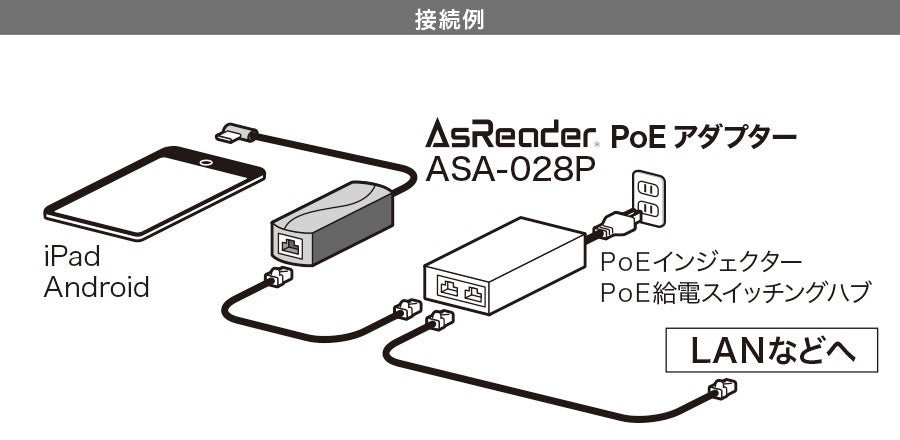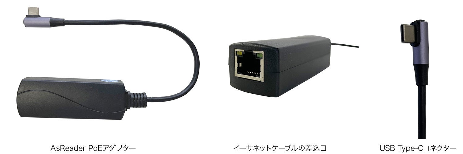 AsReader「ASA-028P」は、PoEで受電した電力を自身で使いつつ、USB Type-Cに変換し配下のスマートデバイス等に給電するアダプターです。