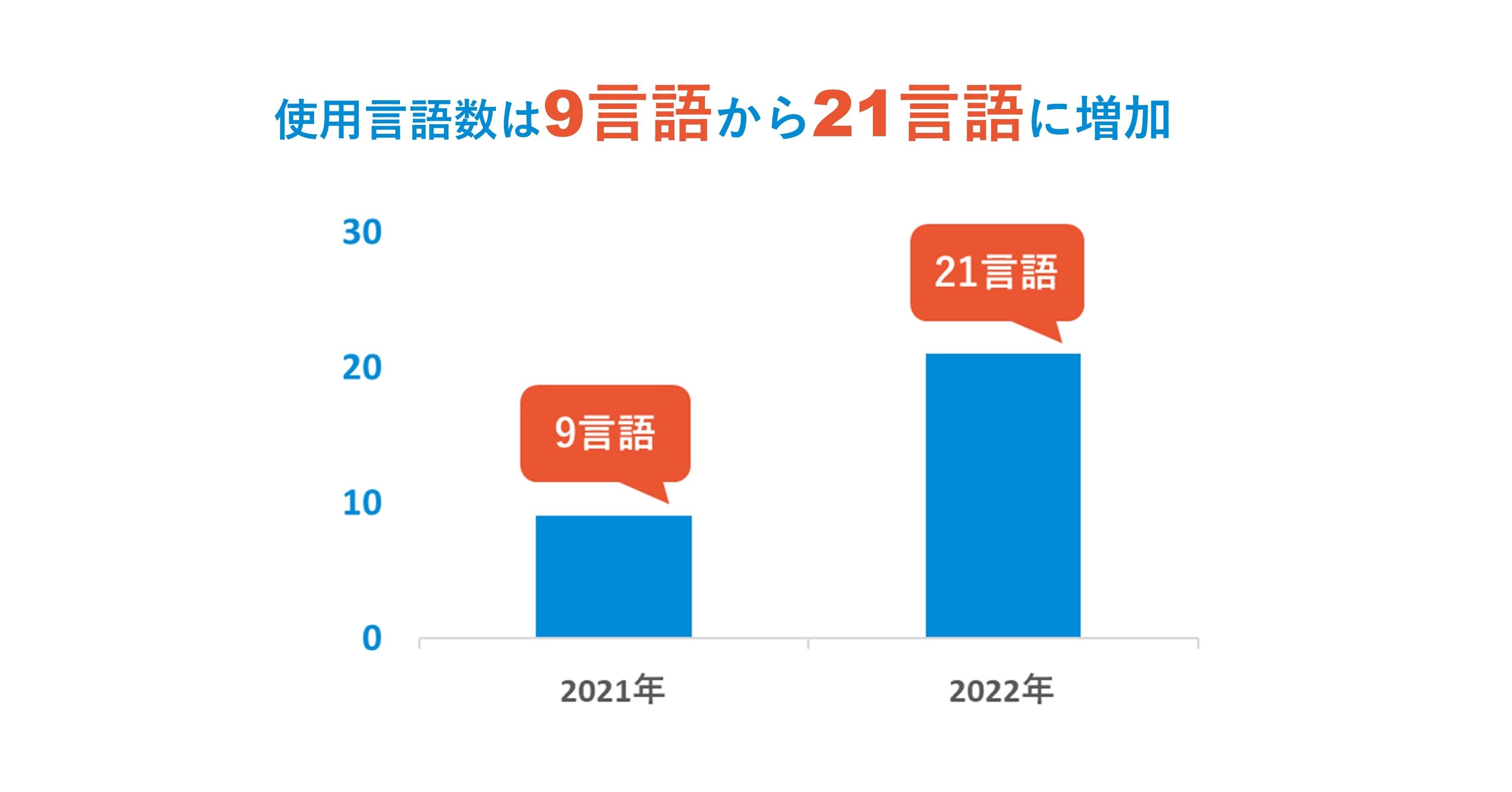 当社が提供する宿泊施設向け多言語コミュニケーションツール「Kotozna In-room」は、宿泊客が施設案内や周辺観光情報などを自分の言語で確認することや、施設内のどこからでもスタッフと母国語同士でチャットができるサービスです。2020年10月より販売開始し、109言語に対応しています。今回、国内宿泊施設での「Kotozna In-room」利用者のリクエスト数を集計したところ、外国語でのリクエスト数は2021年5月1日~31日に対し、2022年5月1日~31日では約7倍に増加しました。さらに、同期間での全言語でのリクエスト総数に占める外国語の割合は1.77%から2.22%と、約1.3倍に増加していることが見て取れます。