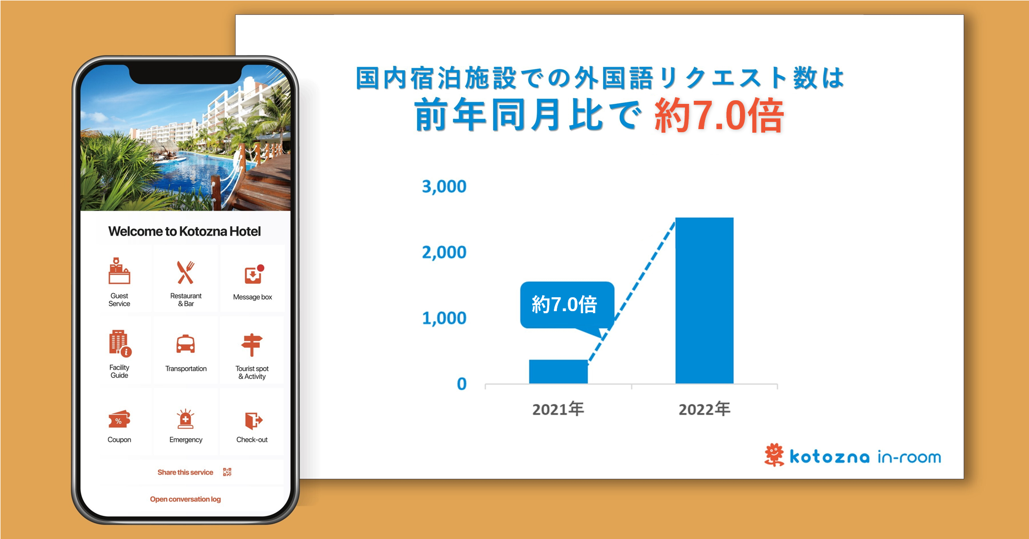 (コトツナインルーム・https://kotozna.com/in-room )を国内にて、JTBと販売開始。インバウンド低迷の中、DX、ソーシャルディスタンスに有効と評価を得て、現在(2022年6月時点)、全国のホテル・旅館など200以上の施設に導入。