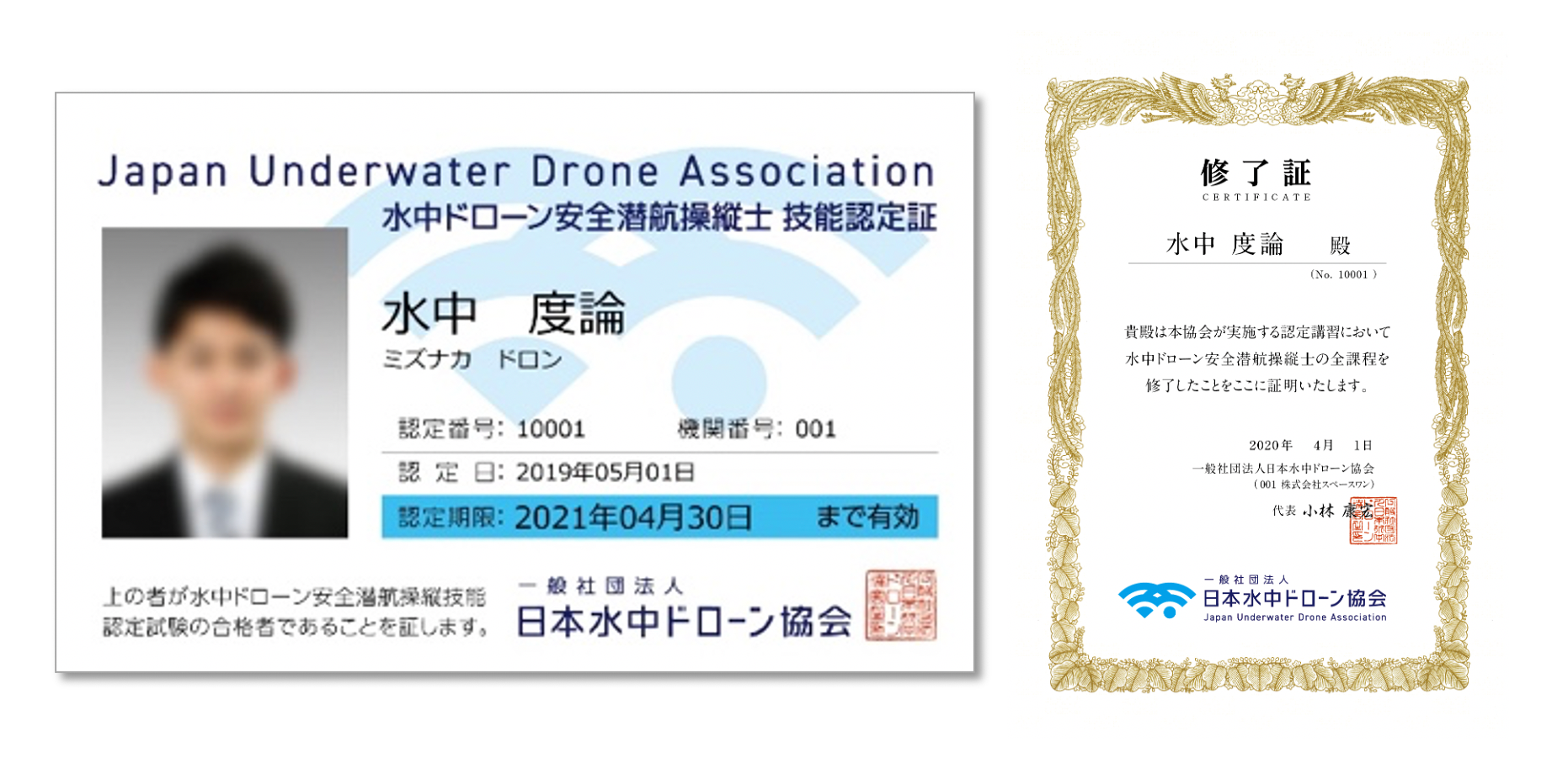 日本水中ドローン協会が策定する人材研修プログラムで、優れた技能と安全、法律などの基礎的な知識を持った水中ドローン操縦士を養成するための独自の講習を行い、修了者にはライセンス証を発行しています。また、当ライセンスは賠償保険を水中ドローン操縦ライセンスに自動付帯されている他にはない大きなメリットをもつライセンスとなります。こうしたサービスの拡充も進めており各業界から、多くの反響とともに非常に注目を浴びている認定資格です。