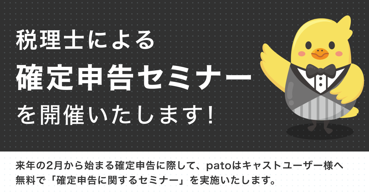 patoでは、来年度の確定申告に向け、patoはキャストユーザー様を対象とした無料の「確定申告に関するセミナー」を実施いたします。