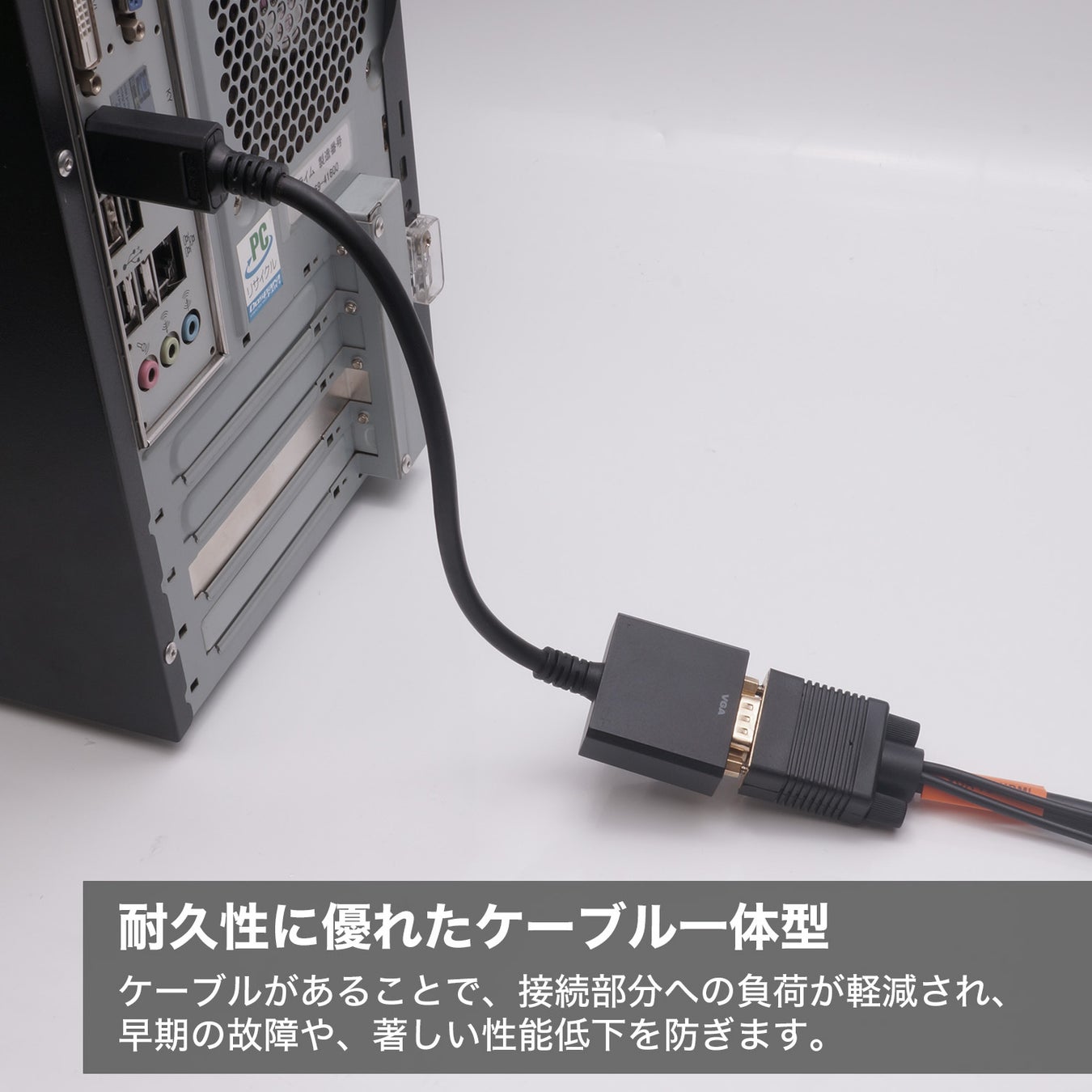 HDMI端子を搭載したパソコンなどから、VGA端子を搭載したディスプレイモニターなどへ映像出力が行えます。プラグアンドプレイで簡単にデジタル信号をアナログ信号へ変換可能です。