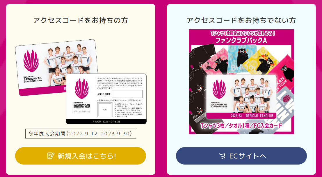 本ファンクラブは、くまもと再春館製薬所バドミントンチーム ONLINE SHOP「LOVE BADMINTON」にて販売中の<FC入会パック>をご購入いただいた方にご入会いただけるサービスです。