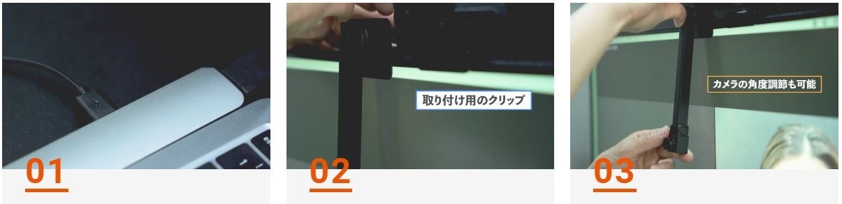 MEGA-AUは、パソコン画面の中央にWebカメラを固定して、Web会議の相手と目線を合わせながら会話ができる製品です。取り付けはパソコンの上部にMEGA-AUのクリップ部分をひっかけて固定するだけで完了し、一度設置すると長時間の会議でも位置がズレることなく快適にご利用いただけます。
