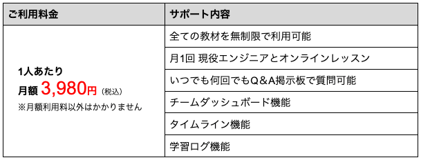 疑問をすぐに解消できる回答率100%のQ&A掲示板や、アウトプットしながら学ぶことができる40種類以上の学習教材を、1人あたり税込3,980円/月で提供します。サブスクリプション型だからこそ実現できる「いつでもどこでも使い放題」というメリットを、挫折しやすいと言われるプログラミング学習をはじめとした、多種多様なIT研修にお役立ていただけます。