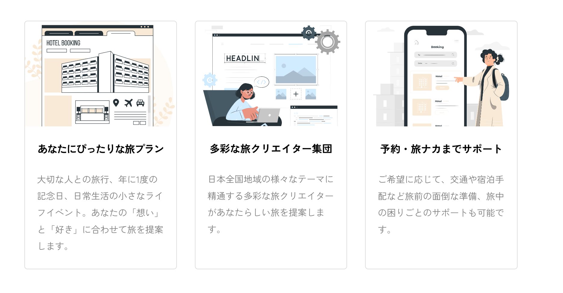 インターネットには多数の情報がある一方で、お客様が情報の海の中から、検索を繰り返し旅行を企画することが負担になり、多くの旅行者は一回の旅行を計画するだけで膨大な時間がかかっており、「旅計画」に現状の旅の計画に課題を感じている方が多くいます。「検索してはじまる旅」という常識から、「想いからはじまる旅」という新しいスタンダードを実現するため、本事業を立ち上げました。