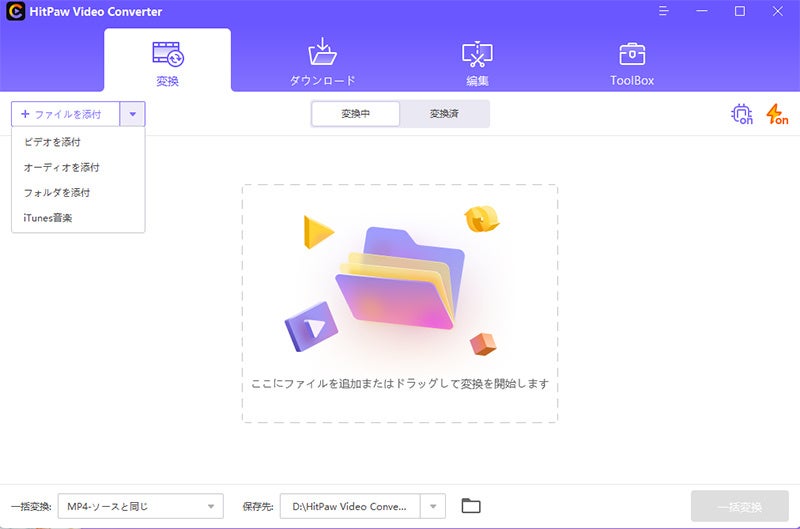 Step1: コンピュータにHitPaw Video Converterを無料でダウンロードします。起動し、メインインターフェイスから[ファイルを添付]を選択します。