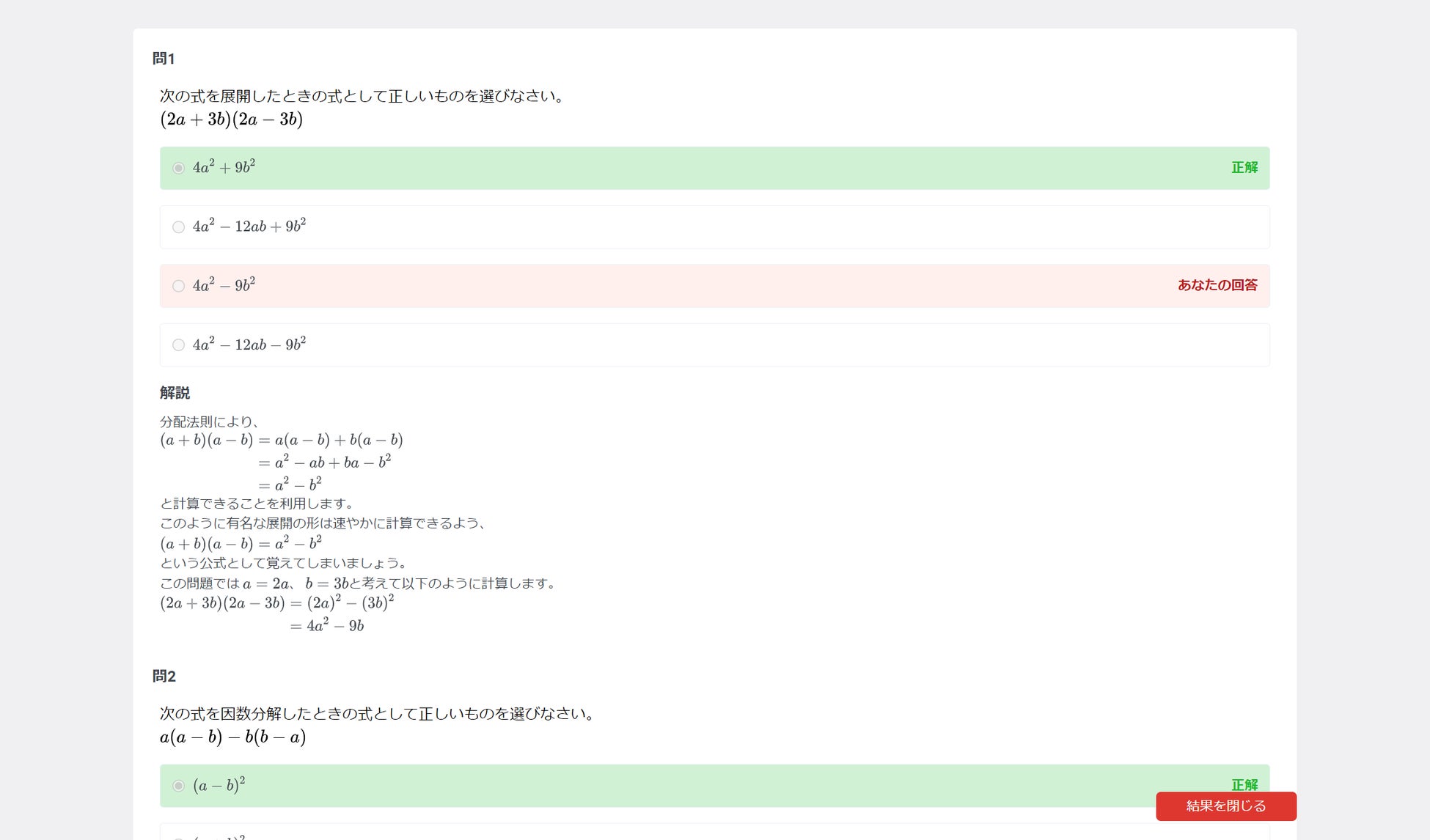さらに、解説画面には「同じ範囲のテストを再び行う」「間違えた問題だけを再挑戦する」ための2種類の再チャレンジボタンがあります。これにより、勉強には必須の見直し・やり直しまで自分の好みの形式でスムーズに取り組むことができます。
