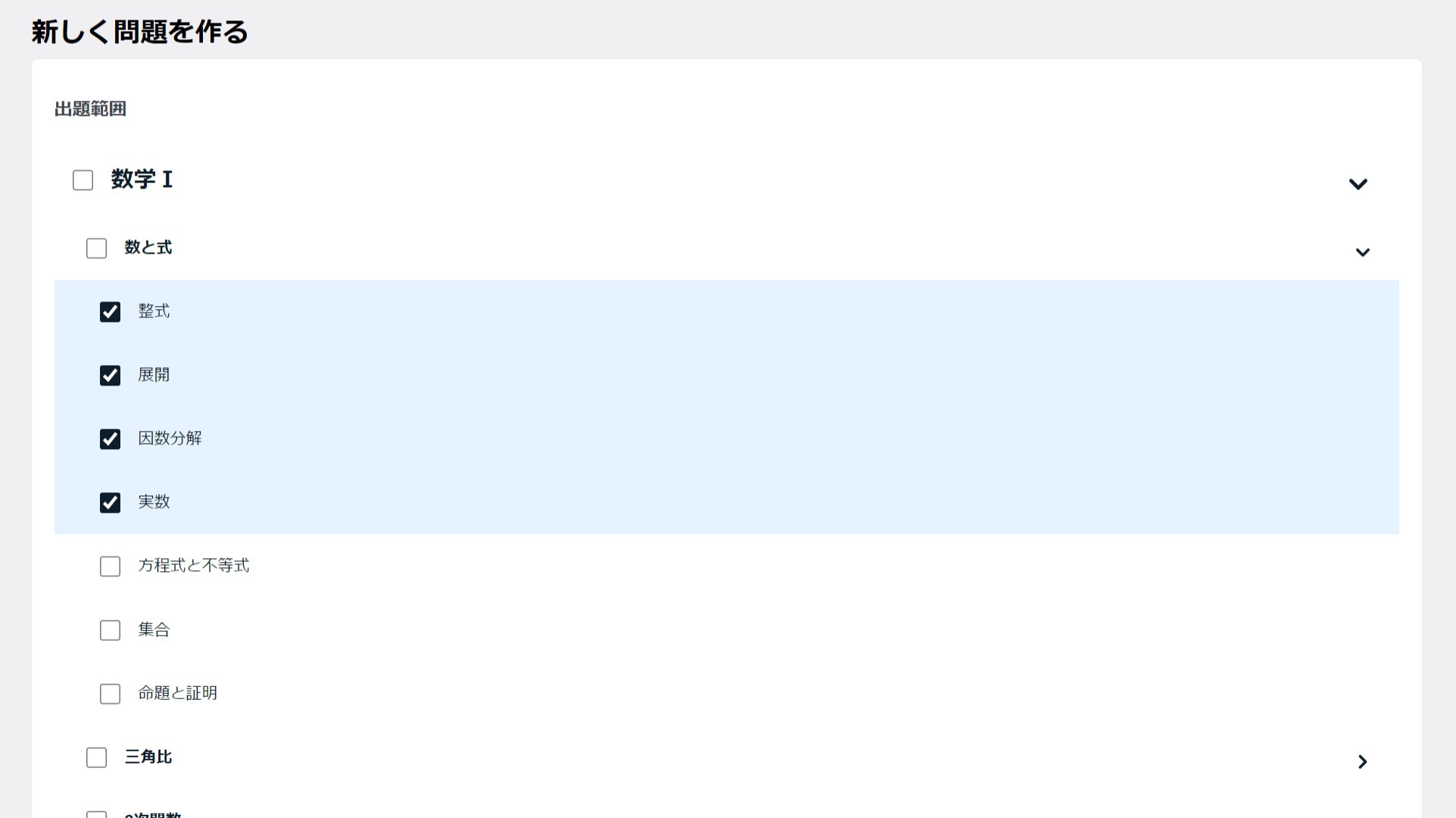 ラクシマスでは、自分の勉強したい単元を選択すると、選んだ範囲それぞれから基本問題10問をランダムで選んだ小テストを自動で作成します。範囲選択は小単元まで細かく分かれており、広い範囲を勉強したいときでも、まんべんなくランダムに問題を抽出できるため、教科書を見ながら自分で問題を選ぶ手間が省けます。