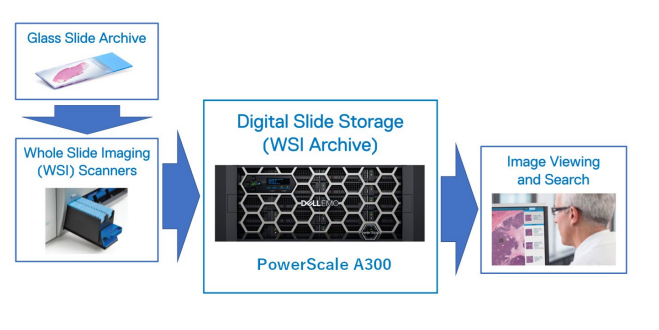 「PowerScale」導入以前の環境では、デジタル病理画像向けストレージ基盤の改善が必要でした。がんの病理診断は、患者から採取した細胞や組織から標本(スライド ガラス)を作成し、顕微鏡で観察する方法で行われています。これに対して、現在では、標本をデジタル化した画像で病理診断(パソロジー)を行うことも可能になっています。しかしながら、病理診断をデジタルで行う「デジタル パソロジー」に取り組んでいたものの、オンライン ストレージがそのボトルネックになっていました。生検であればスライド ガラス1枚分で数GB、手術中の検体では10GB超のデータが十数枚作成される場合もあります。しかも、病理診断の依頼件数は年間で平均約4万件もあるため、毎月約40TBずつデータが増えていくような状況でした。同病院の以前のストレージ環境では、この増え続ける大容量データをすべて受け止めることができませんでした。さらに、ストレージにデータが入り切らないことから、診断が終わったデータは、一定期間が経過した後に毎日テープ ライブラリー装置へ退避させており、過去データを再度参照する必要が生じた場合には、その都度テープからデータを戻さなくてはなりませんでした。