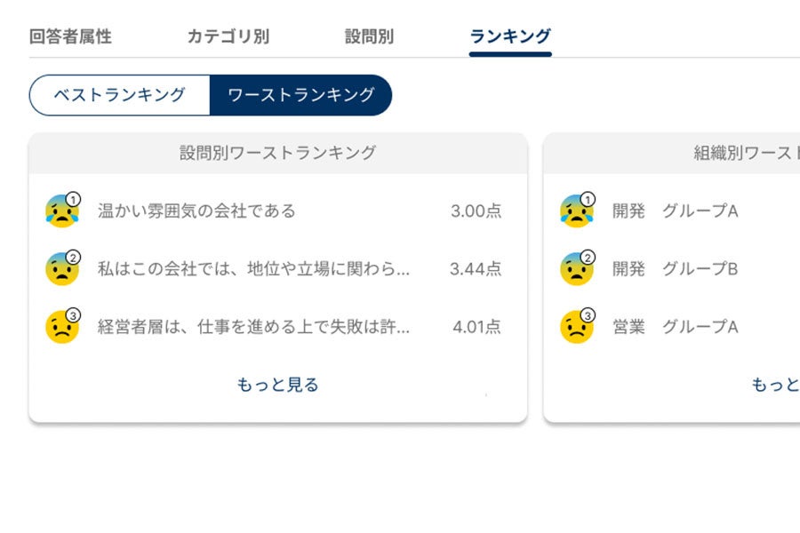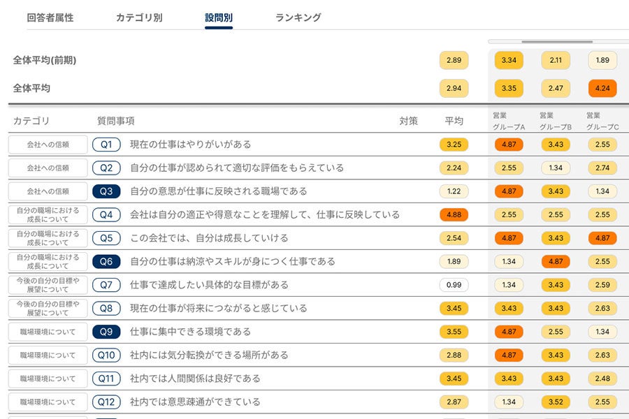 仕事、自分の職場における成長、今後の自分の目標や展望、職場環境について、上司、組織文化、待遇について仕事の負担、福利厚生、経営層、人事についてなど一般的な従業員満足度の設問回答により従業員の会社に対する満足度の見える化が図れます。