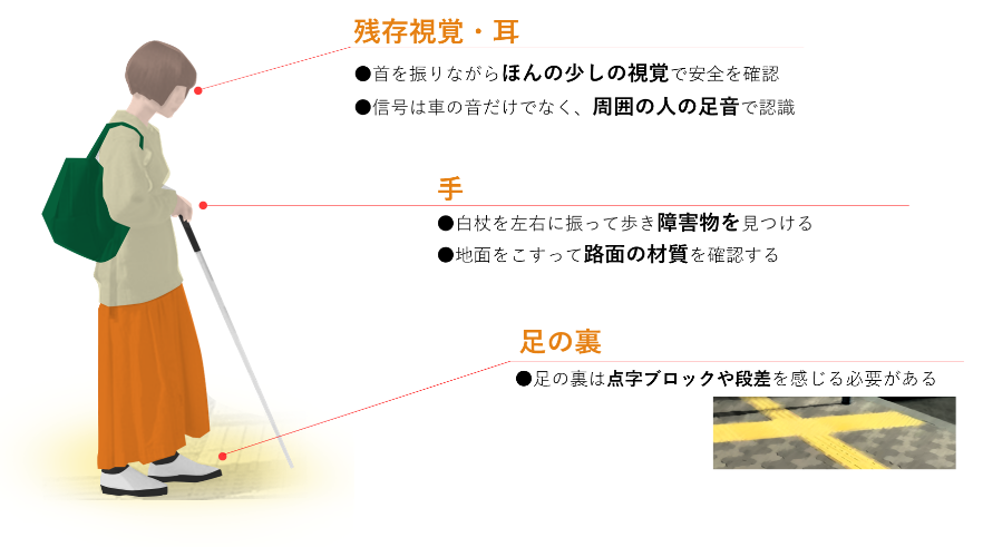 視覚障がい者の単独歩行には様々な課題があります。