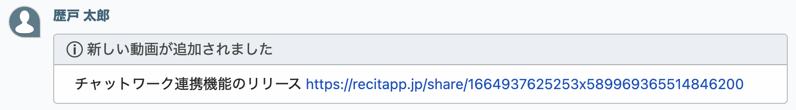 手順に従ってChatworkと連携していただくと、recitに動画が追加された際や、視聴・コメント及びコメントへの返信時に、自動でChatwork上に通知が行われます。