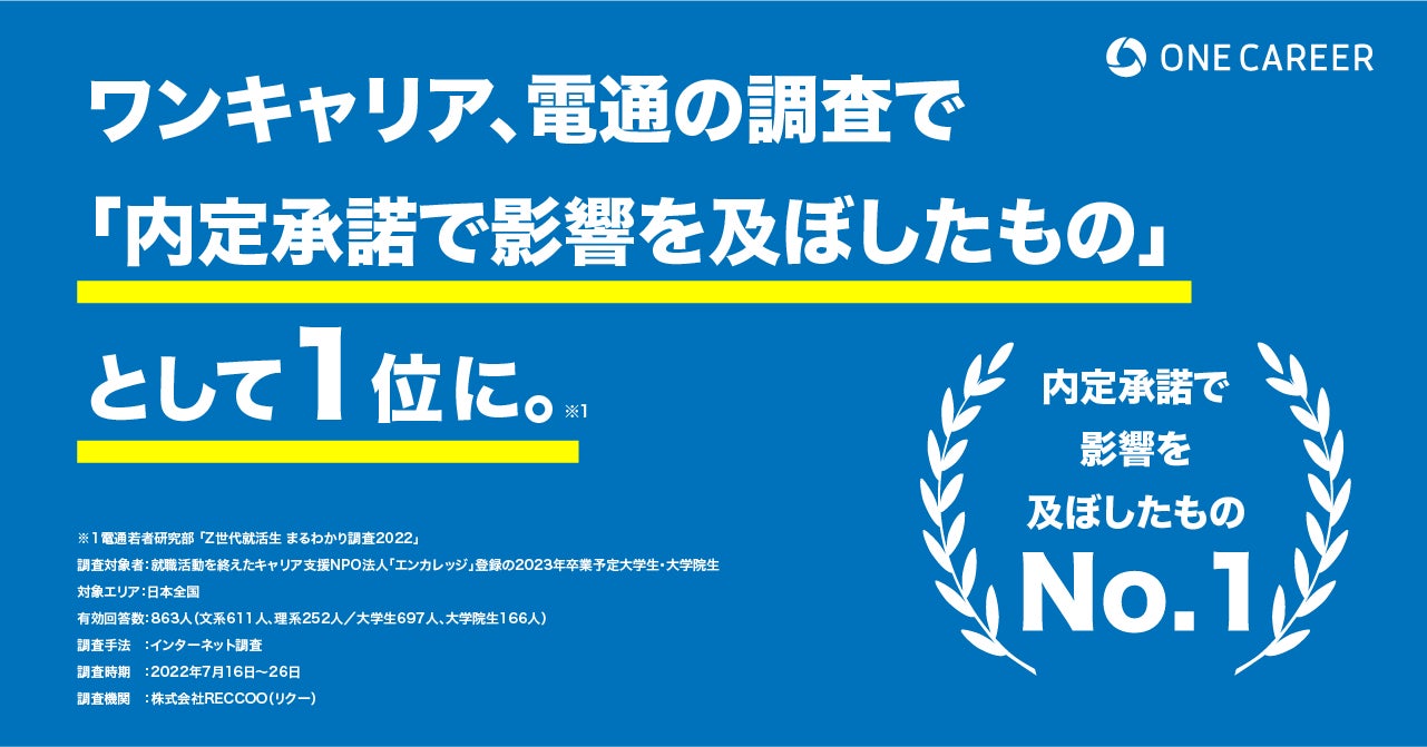 はじめてのキャリアを選ぶ、就活サイト「ONE CAREER」は、新卒入社までの最初のキャリア選択をサポートするサービスです。企業の採用活動に関する50万件(※1)を超える就職活動の体験情報を集め、1万社(※2)を超える企業のキャリアデータを蓄積しています。新卒領域において就職活動の情報収集・分析ツールとして多くの学生に支持され、2人に1人以上の学生に利用いただき、2023年卒学生が1年を通して最も利用した就職サイトランキングで2位(※3)を獲得しております。