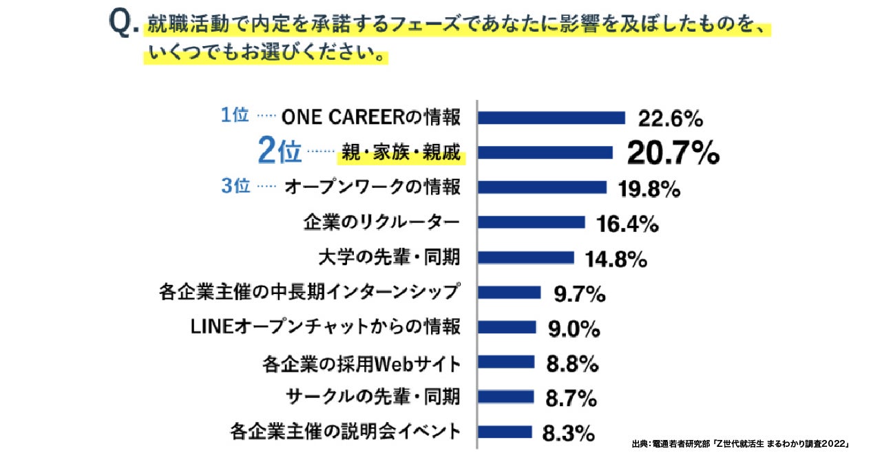 今回、同調査の「就職活動で内定を承諾するフェーズであなたに影響を及ぼしたものを、いくつでもお選びください。」という質問項目において、就活サイト「ONE CAREER」が1位を獲得しました。本結果より、就活サイト「ONE CAREER」は2位にある「親・家族・親戚」よりも学生の企業選びに影響を与えているということが明らかになりました。