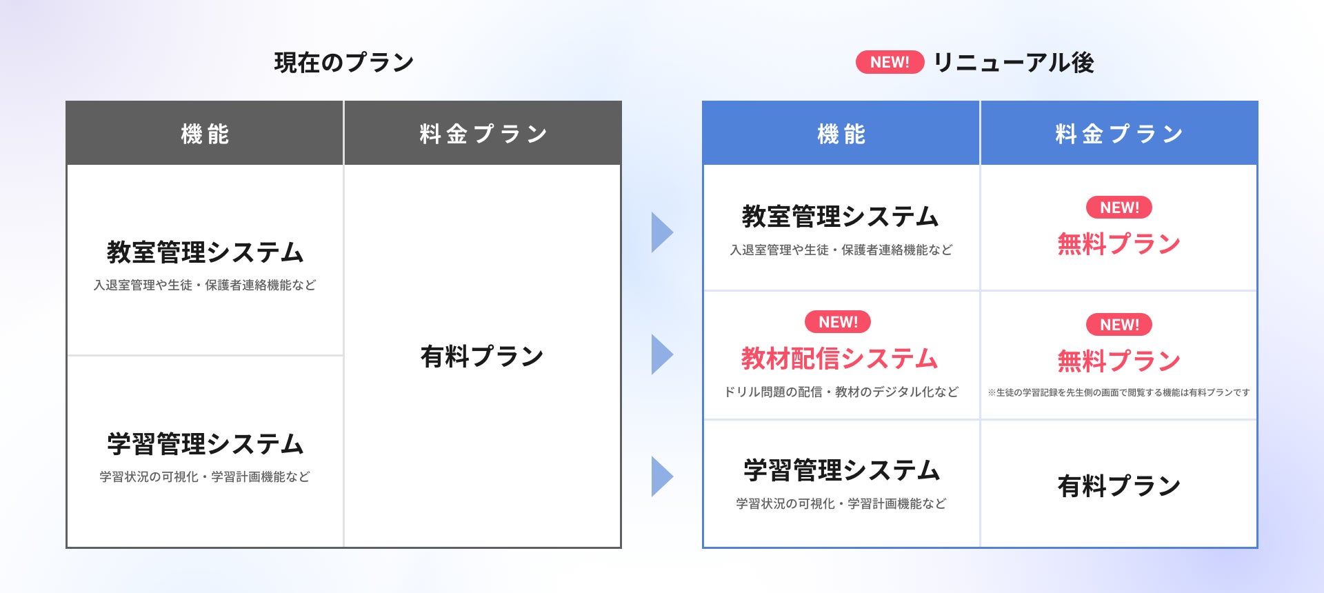 現在、「Studyplus for School」では、「教室管理システム」「学習管理システム」を有償提供しています。今回のリニューアルを通じて、現在提供中の「教室管理システム」、新たに対応を開始する「教材配信システム」を合わせて無償提供する、無料プランをご用意することになりました。