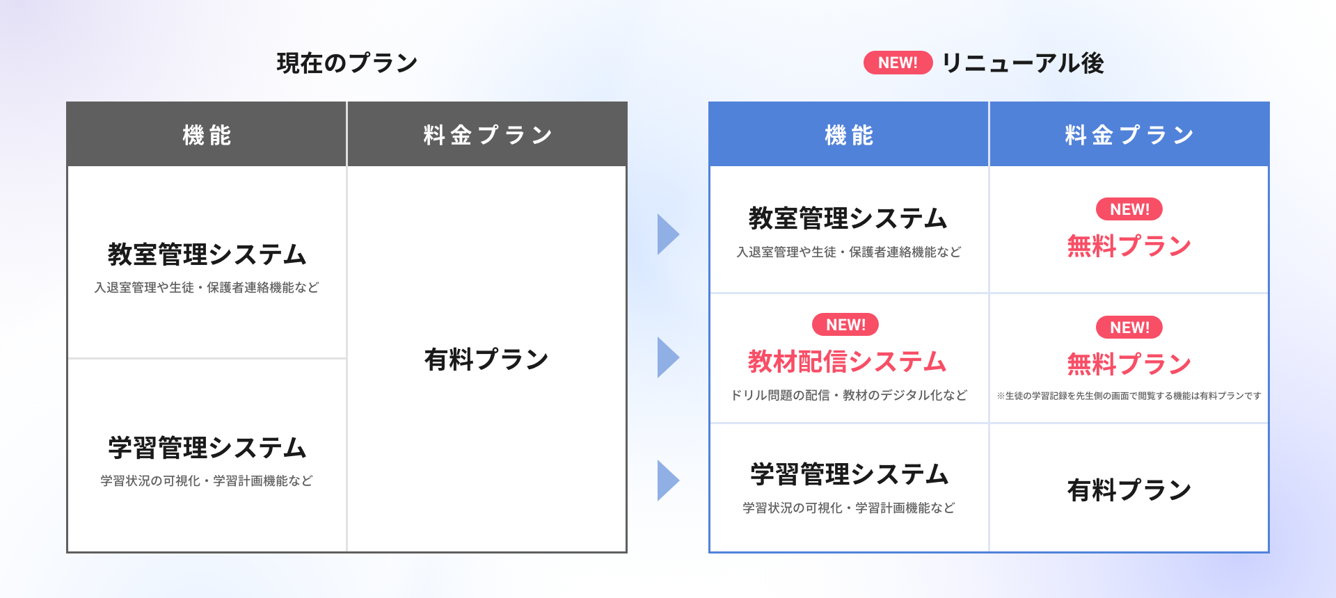 現在、「Studyplus for School」では、「教室管理システム」「学習管理システム」を有償提供しています。今回のリニューアルを通じて、現在提供中の「教室管理システム」、新たに対応を開始する「教材配信システム」を合わせて無償提供する、無料プランをご用意することになりました。