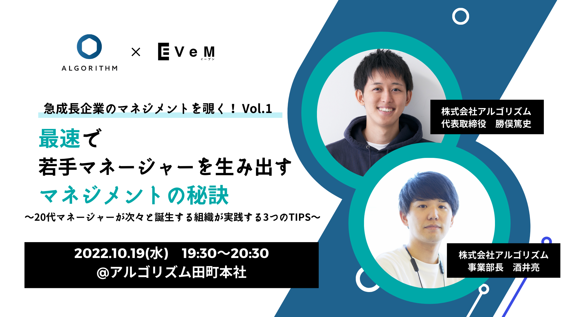 本イベントは、「急成長企業のマネジメントを覗く!」と題し、株式会社EVeMの主催で、社内での「チームビルディング」「マネージャー育成」「経営チーム作り」にスポットを当てて、より強いチームを作っていくための秘訣を深掘っていく企画となります。