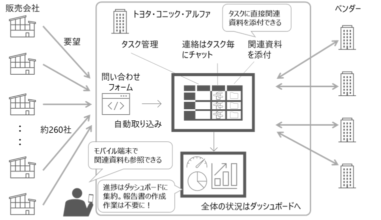 トヨタ・コニック・アルファでは、約260社の販売会社の要望を取り込みながら、アジャイル開発を進めており、ベンダーごとの懸案事項やタスクを複数のExcelファイルで管理していました。