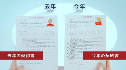 今作も新CM『電子契約で契約更改』篇ではカズレーザーさんを起用し、『CM契約更改チャレンジ』と題して、カズレーザーさんがご自身のCM契約の内容を確認してから契約するまでの様子を描いています。今年の契約書は去年の契約書から何が変わっているか、目視では違いが分かりづらく苦心するカズレーザーさんが、Adobe Acrobatのファイル比較ツールを使うことによって2つの文書の違いを瞬時に確認し、更には内容の修正や電子契約までできることを表現しています。CM最後には前作からお馴染みのサウンドロゴに合わせて、煩雑な作業から解放され、軽やかに跳躍する姿も見どころです。