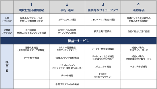 企業は、セミナー配信機能・情報コンテンツ配信機能によるプログラムの配信と、学習結果の収集が可能となります。給与と定年年齢を入力することで老後に必要な資金を算出し、ライフプランに応じたシミュレーション機能を備えることで、従業員毎に必要な資産運用のプラン策定を行えます。また、従業員は、不明点が発生した場合に、チャット機能を活用し、専門家に問合せを行うことができます。これらの機能によって一人ひとりのニーズに応じた学習プログラムを生成いたします。