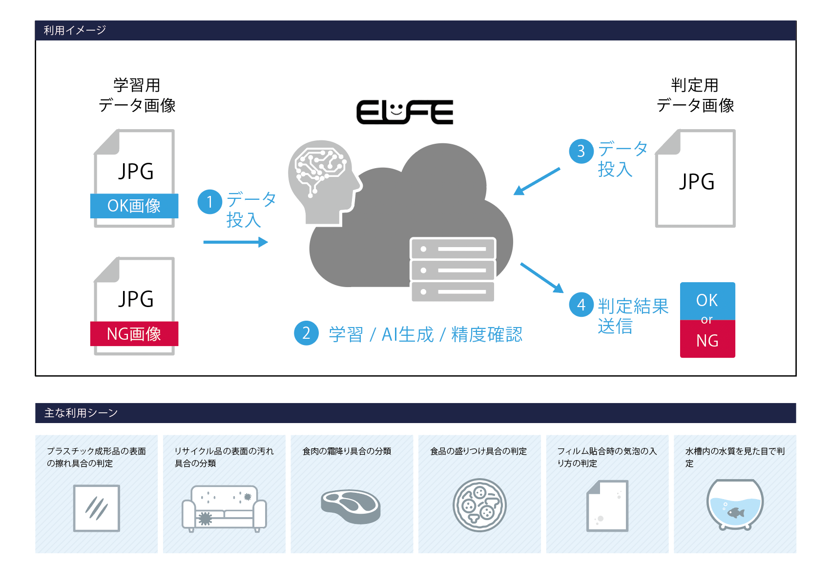 ELFEは判別モデルを自動開発する技術「Evolutional Learning for Feature Extraction」を採用した画像判別AIソリューションです。ソニー独自開発技術により、一般的な開発手法と比較して1/100程度の教師データでのAI開発を実現します。またデータをアップロードするだけでAIを自動生成できるため、AI初学者の方でもノーコードで開発が可能です。