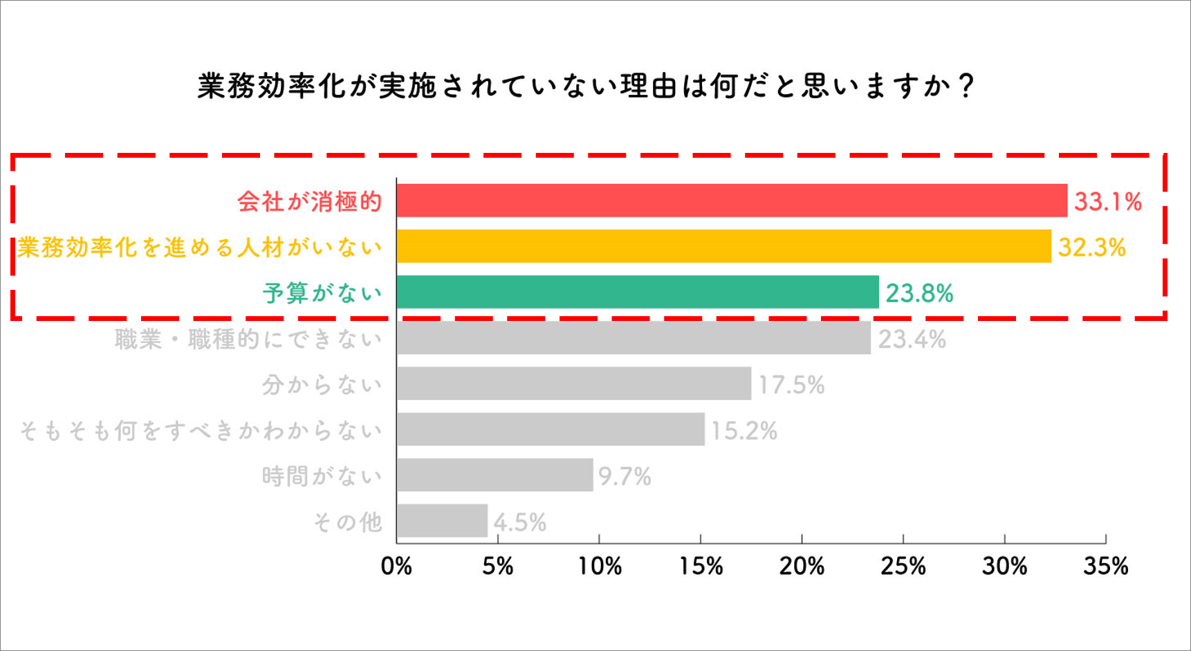 業務効率化が実施されていない理由として「会社が消極的」が最も多く33.1%、次に「業務効率化を進める人材がいない」32.3%、「予算がない」23.8%という結果になりました。