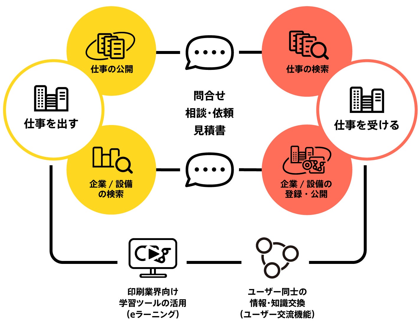 「Primarelink™」は、新たなビジネスパートナーを見つけることができる、印刷業界に特化したシェアリングプラットフォームです。2022年3月のベータ版公開、6月の正式サービス提供開始以来、約70社の方々にご登録いただいています。