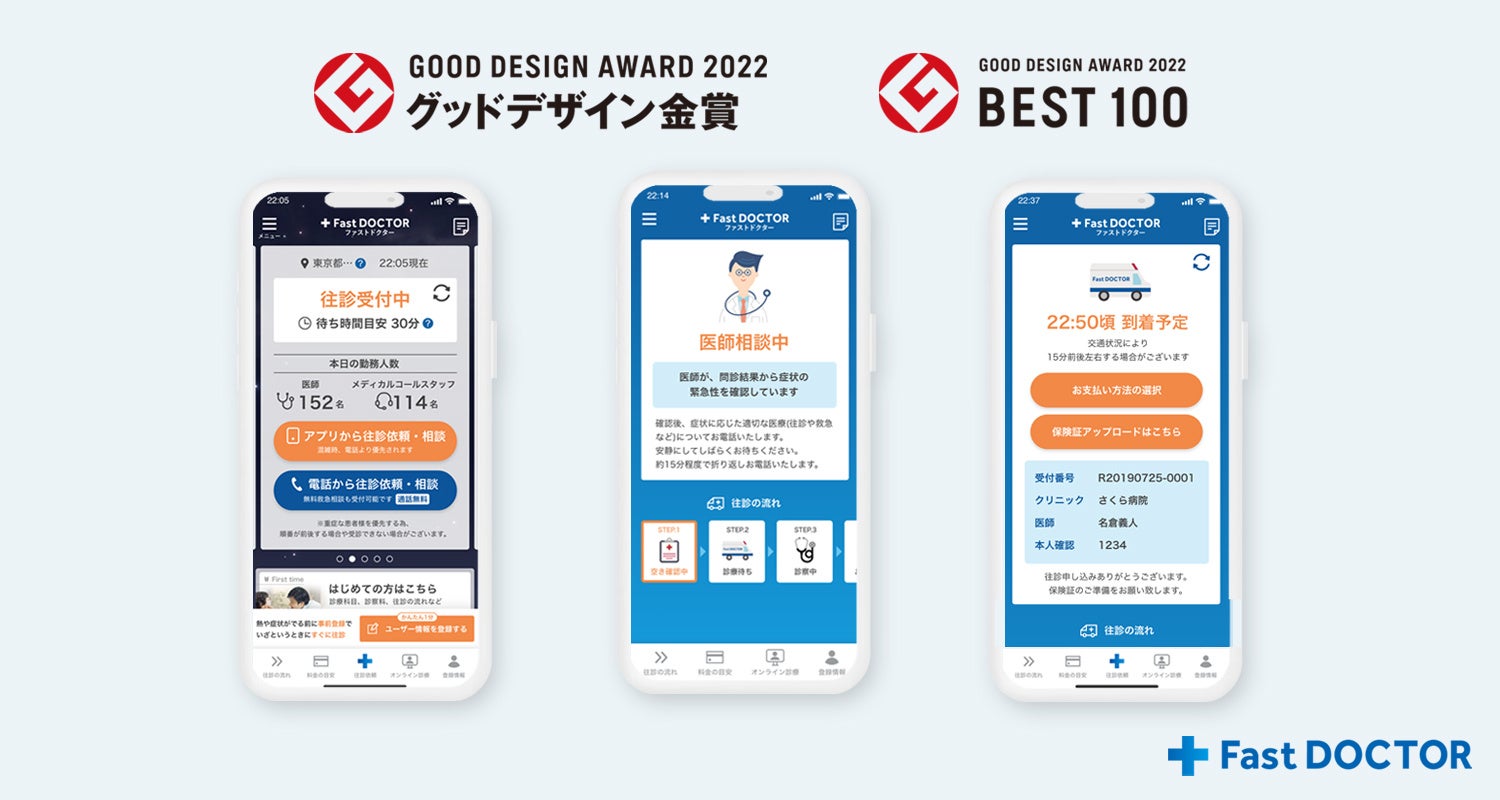 「グッドデザイン賞」は公益財団法人日本デザイン振興会が主催するもので、1957年以降、国内のあらゆる製品・サービスなどを審査・選出してきた日本で唯一の総合的なデザイン推奨制度です。2022年度は、5,715件の審査対象の中から1,560件が「グッドデザイン賞」を受賞し、特に優れた100件が、「グッドデザイン・ベスト100」に選出されました。「グッドデザイン金賞」は、「グッドデザイン・ベスト100」の中から選ばれる特別賞としてファストドクターを含め、本年は15件が選出されています。