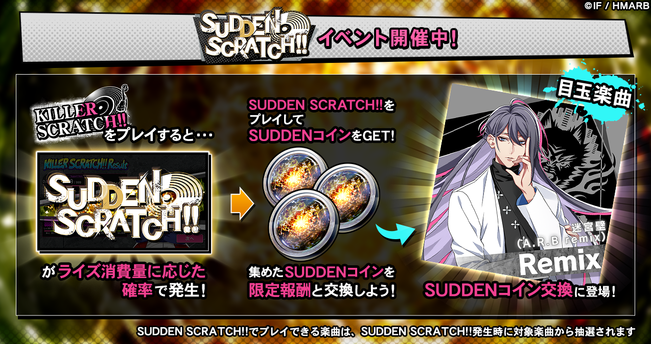 イベント期間中、KILLER SCRATCH!!をプレイするとライズ消費量に応じた確率でSUDDEN SCRATCH!!が発生します。SUDDEN SCRATCH!!をプレイすると、通常の報酬アイテムの他、限定アイテム「SUDDENコイン」を獲得することができます。「SUDDENコイン」を集めることで、新楽曲「迷宮壁(A.R.B remix)」と交換することが可能です。詳細はアプリ内お知らせをご確認ください。